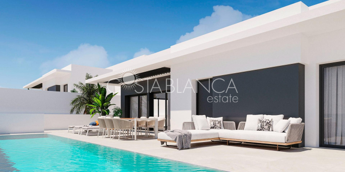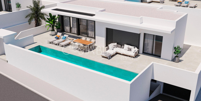 Moderne Luxusvilla mit Bergblick in Ciudad Quesada, Costa Blanca Zeitgenössisches Design und außergewöhnlicher Komfort Entdecken Sie diese elegante Neubauvilla in Ciudad Quesada, einer der begehrtesten Wohngegenden an der Costa Blanca. Auf einem 300 m² großen Grundstück mit einem wunderschön angelegten Garten und einem privaten 3x12 m großen Swimmingpool gelegen, bietet diese Villa die perfekte Mischung aus moderner Architektur, natürlicher Schönheit und mediterranem Komfort. Die Immobilie verfügt über 265 m² Innenfläche, die sich auf zwei Ebenen verteilen und so gestaltet sind, dass Licht, Raum und Funktionalität optimal genutzt werden. Große Fenster durchfluten die Wohnbereiche mit natürlichem Sonnenlicht und bieten gleichzeitig einen atemberaubenden Blick auf die Berge und die umliegende Natur. Geräumiger Grundriss mit flexiblen Wohnmöglichkeiten Die Villa verfügt über 4 Schlafzimmer, mit der Möglichkeit, ein 5. Schlafzimmer oder einen zusätzlichen Wohnbereich zu schaffen, der sich perfekt an Ihren Lebensstil anpasst. Im Erdgeschoss finden Sie einen offenen Wohn- und Essbereich, der mit einer modernen, voll ausgestatteten Küche mit hochwertigen Geräten verbunden ist und einen nahtlosen Übergang zur Terrasse und zum Poolbereich schafft – ideal für Unterhaltung oder Entspannung im Freien. Auf der unteren Ebene (Unterbau) bieten die übrigen Schlafzimmer eine kühle und ruhige Atmosphäre mit direktem Zugang zum Garten. Zur Immobilie gehören außerdem eine geschlossene Garage, ein Waschraum und eine hochwertige Ausstattung. Hochwertige Ausstattung und nachhaltige Merkmale Jedes Detail dieser Villa wurde sorgfältig auf Komfort und Effizienz ausgelegt. Dazu gehören: Voll ausgestattete Küche mit integrierten Geräten Badezimmer mit Möbeln, Duschwänden und elektrischen Handtuchwärmern Klimaanlage über Kanäle (vollständig installiert) Photovoltaik-Solarmodule zur Energieeinsparung Elektrische Rollläden im Wohnzimmer und in den Schlafzimmern Panzertür für maximale Sicherheit Erstklassige Lage in Ciudad Quesada Eingebettet in einer exklusiven und ruhigen Gegend genießt diese Villa eine unschlagbare Lage in der Nähe von allem. Der Golfplatz La Marquesa ist nur 1 km entfernt und bietet einen Zufluchtsort für Golfliebhaber. Die mit der Blauen Flagge ausgezeichneten Strände von Guardamar del Segura sind nur 6 km entfernt, während Torrevieja und Orihuela Costa in weniger als 15 Minuten zu erreichen sind. Der internationale Flughafen Alicante ist ca. 40 km (35 Minuten) entfernt und gewährleistet eine hervorragende Anbindung. Erleben Sie den mediterranen Lebensstil Umgeben von Orangenhainen, Sportclubs, Restaurants und allen wichtigen Dienstleistungen bietet Ciudad Quesada eine lebendige und dennoch ruhige Umgebung. Es ist der ideale Ort für diejenigen, die ein luxuriöses Zuhause in der Sonne suchen; perfekt als Dauerwohnsitz, Urlaubsdomizil oder Investitionsobjekt. Kontaktieren Sie uns noch heute, um einen Besichtigungstermin zu vereinbaren und das Beste des mediterranen Lebens in Ihrem neuen Zuhause in Ciudad Quesada zu erleben.