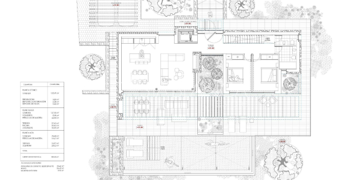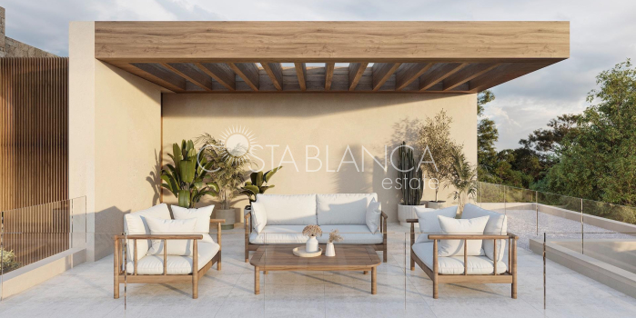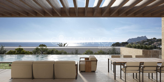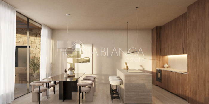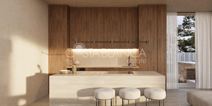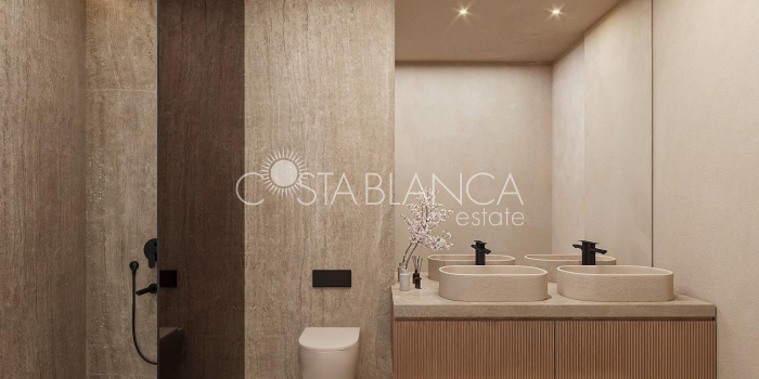 Moderne Villa mit Panoramablick auf das Meer in La Fustera, Benissa Costa Diese exklusive Neubauvilla, die von einem renommierten Architekten entworfen und von einem lokalen Bauträger mit mehr als 20 Jahren Erfahrung entwickelt wurde, befindet sich auf einem 800 m² großen Grundstück, nur wenige Schritte vom Strand La Fustera entfernt. Die Architektur verbindet mediterrane Wärme mit zeitgenössischer Eleganz und kombiniert Naturstein, Holz und sanfte, neutrale Farbtöne, die sich nahtlos in die Küstenlandschaft einfügen. Mit einer Gesamtfläche von 716 m², verteilt auf drei Ebenen – Untergeschoss, Erdgeschoss und erster Stock – bietet die Villa eine perfekte Balance zwischen Funktionalität, Design und Komfort. Untergeschoss Die untere Etage mit 105,97 m² ist sowohl auf Praktikabilität als auch auf Freizeitgestaltung ausgelegt. Sie umfasst einen voll ausgestatteten Fitnessraum, eine Waschküche und Technikräume, mit der Möglichkeit, zusätzliche Räume als Weinkeller, Kino oder Mehrzweckraum zu nutzen. Auf dieser Ebene befinden sich auch das Filtersystem und die Wassertanks des Pools, wodurch eine effiziente Verwaltung aller technischen Anlagen gewährleistet ist. Erdgeschoss Die Hauptetage mit 137,93 m² präsentiert sich in einem hellen, offenen Grundriss, der die Essenz des mediterranen Lebens einfängt. Das geräumige Wohnzimmer, der Essbereich und die Küche öffnen sich durch große, vom Boden bis zur Decke reichende Fenster zur Hauptterrasse und zum Infinity-Pool und rahmen den unglaublichen Panoramablick auf das Meer ein, der den Charakter dieses Hauses ausmacht. Zwei Doppelschlafzimmer, ein komplettes Badezimmer und eine Gästetoilette vervollständigen diese Etage und bieten Komfort und Funktionalität. Im Außenbereich spendet eine Holzpergola Schatten für den Lounge- und Essbereich, der von üppigen Gärten, Sonnenterrassen und einem 59,40 m² großen Infinity-Pool umgeben ist, der optisch mit dem Meer verschmilzt. Erste Etage Die obere Etage mit 70,19 m² ist für die Master-Suite reserviert – ein privater Rückzugsort mit begehbarem Kleiderschrank, eigenem Bad und einer großen privaten Terrasse mit atemberaubendem Blick auf das Mittelmeer. Ein zweites Schlafzimmer oder ein Büro vervollständigen diese Etage, die auch Zugang zu einem 25,02 m² großen Solarium bietet, ideal zum Entspannen unter der Sonne und zum Genießen der Ruhe der Umgebung. Außenbereich und Lage Diese Immobilie befindet sich in einer ruhigen Wohnstraße, umgeben von modernen Villen, und genießt eine außergewöhnliche Lage, nur 3 Gehminuten vom Strand La Fustera (150 m), der Mandala Beach Bar & Restaurant und wichtigen Annehmlichkeiten wie Supermärkten und lokalen Dienstleistungen entfernt. Diese Villa wurde mit Schwerpunkt auf Licht, Raum und nahtlosem Übergang zwischen Innen- und Außenbereich entworfen und verkörpert den modernen mediterranen Lebensstil – elegant, entspannt und in perfekter Harmonie mit dem spektakulären Panoramablick auf das Meer. Sichern Sie sich Ihre Traumvilla in La Fustera, Benissa Costa, und genießen Sie den ultimativen mediterranen Lebensstil mit atemberaubendem Meerblick und unvergleichlichem Komfort.