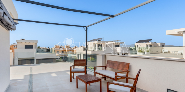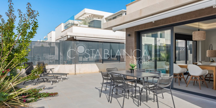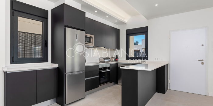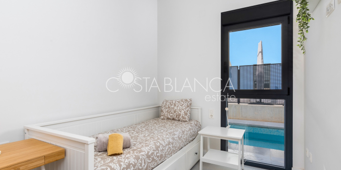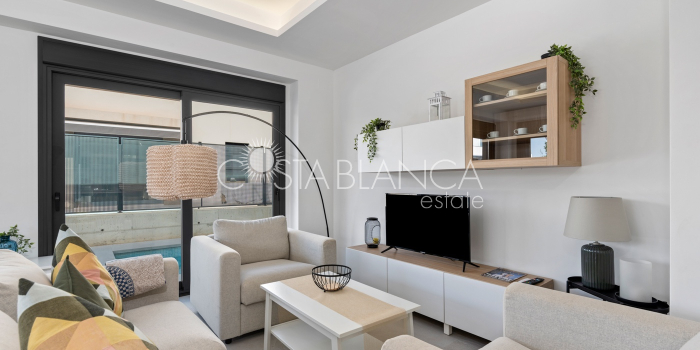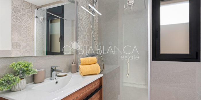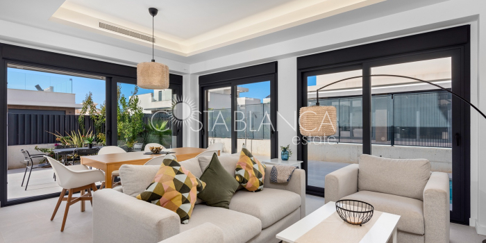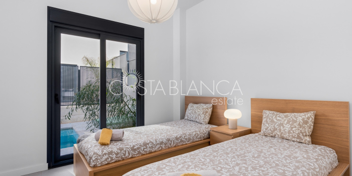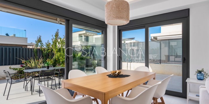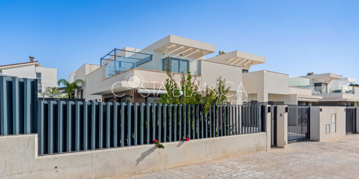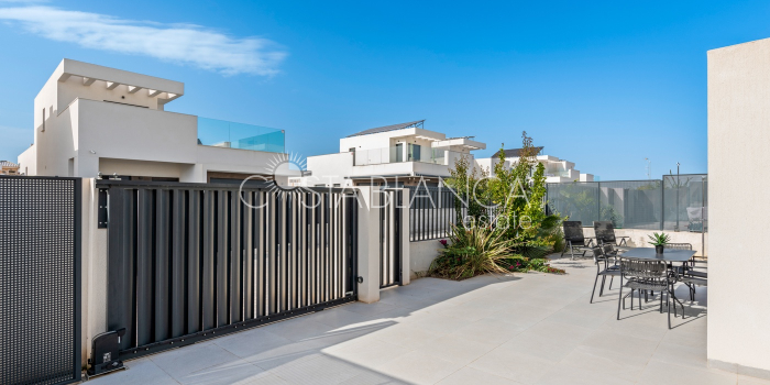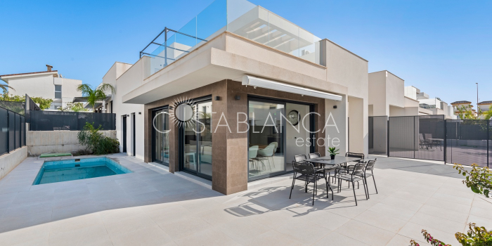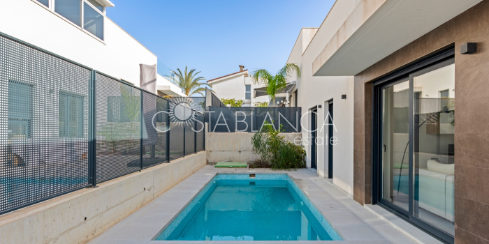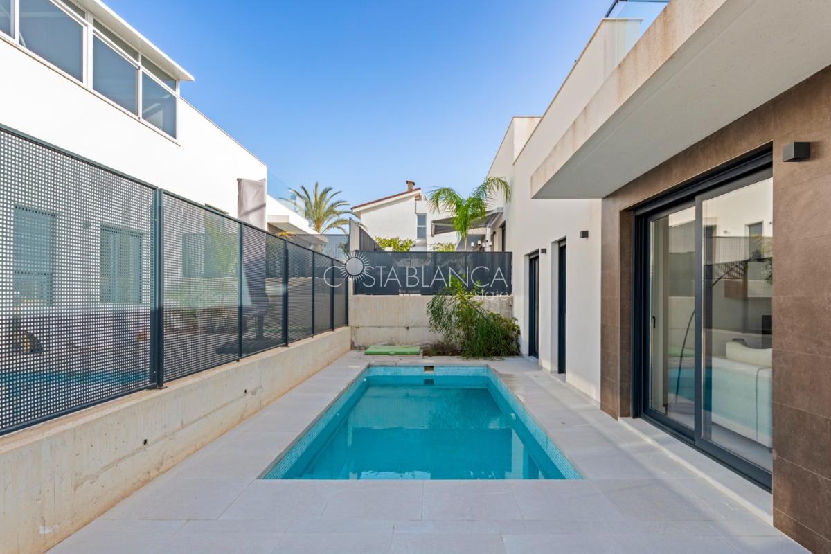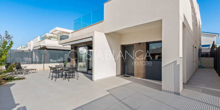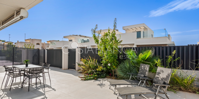 Modernes Doppelhaus (Semi-adosado) in einer ruhigen Gegend von San Fulgencio, auf einem Grundstück mit privatem Pool und Außenbereich zum Entspannen. Das Haus wurde so konzipiert, dass der Garten eine natürliche Erweiterung des Wohnbereichs bildet – große Fensterflächen sorgen für viel Tageslicht und schaffen helle, großzügige Räume mit einer offenen Verbindung zur Umgebung. Die Immobilie erstreckt sich über zwei Etagen. Das Erdgeschoss verfügt über ein geräumiges Wohnzimmer mit offener Küche und direktem Zugang zum Garten. Auf dieser Ebene befinden sich außerdem zwei separate Schlafzimmer, ein Badezimmer mit Zugang vom Flur sowie ein separater Hauswirtschaftsraum, der als Waschküche und zusätzlicher Stauraum genutzt werden kann. Das Obergeschoss bildet den privaten Bereich der Eigentümer und umfasst ein Schlafzimmer mit eigenem Bad sowie Zugang zu einer großen, sonnigen Terrasse – ideal zum täglichen Entspannen. Das Haus wurde 2022 gebaut und bietet einen modernen Standard sowie eine funktionale Raumaufteilung. Die Lage verbindet Komfort im Alltag mit der Nähe zur Natur – die Immobilie befindet sich etwa 5 km vom Strand und rund 30 km vom Flughafen Alicante-Elche entfernt. In der Umgebung befinden sich natürliche Dünen, breite Sandstrände und eine ruhige Wohngegend. Diese Immobilie eignet sich sowohl als dauerhafter Wohnsitz als auch als Investition – dank ihrer funktionalen Aufteilung, der modernen Architektur und der guten Lage ist sie in beiden Fällen eine attraktive Wahl.