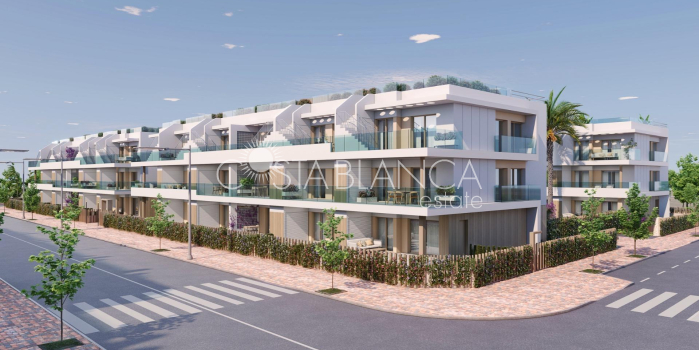 NEW BUILD RESIDENTIAL COMPLEX IN PILAR DE LA HORADADA New Build residential of apartments and penthouses with exceptional finishes in Pilar de la Horadada. Ground floor apartments with private gardens, middle floor apartments with large terraces and top floor penthouses with private solariums. The kitchen is delivered fully furnished, leaving enough space for you to choose the appliances according to your preferences. Only noble materials have been used, such as interior carpentry made entirely of wood and exterior Climalit/aluminium windows, ideal both for their design and for the high thermal-acoustic level they have. All the terraces are south-facing. Automatic gates in the residential, both for pedestrian access and vehicle access. The building is surrounded by gardens, it will also have a communal swimming pool, parking inside the complex and each property has its own private storage room. In the vicinity of this residential complex you will find all the facilities of public transport, schools, supermarkets, shopping centres, golf courses and fantastic municipal parks with their children's playgrounds. Everything at your fingertips so that you can enjoy an excellent location. Pilar de la Horadada is a typical Spanish village in the most southern part of the Costa Blanca. The large main street has supermarkets, lots of shops, restaurants and bars and some lovely squares. The beautiful beaches of Torre de la Horadada and Mil Palmeras with fine sand promenade is just 5 minutes away. The airports of Corvera (Murcia) and Alicante are respectively 40 and 55 minutes away.