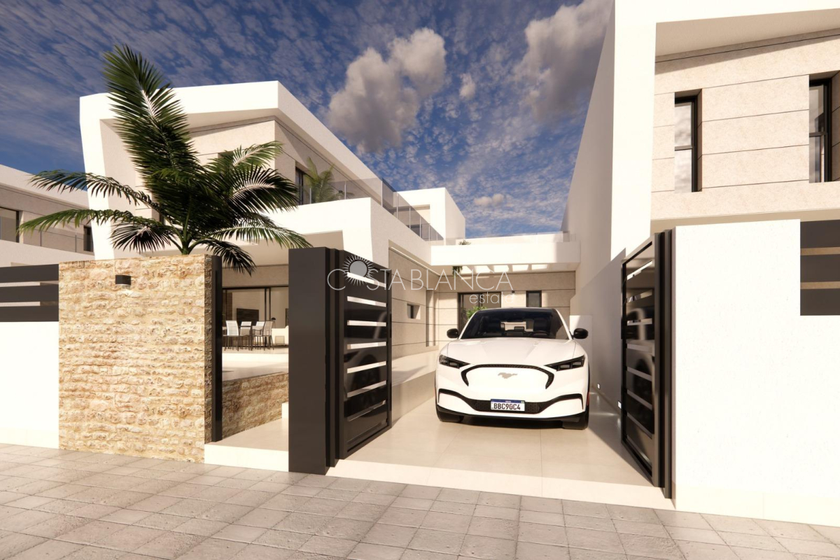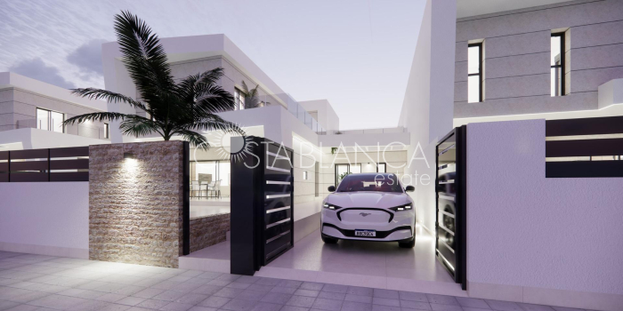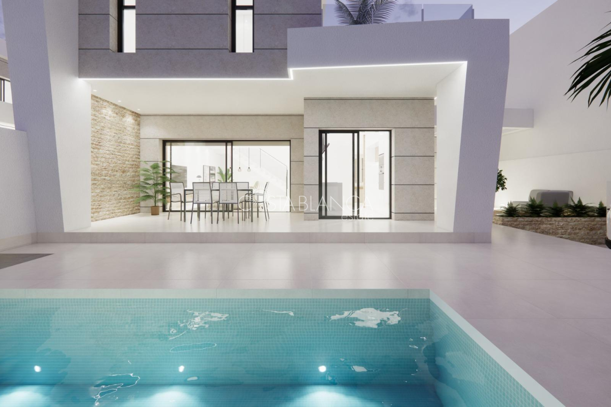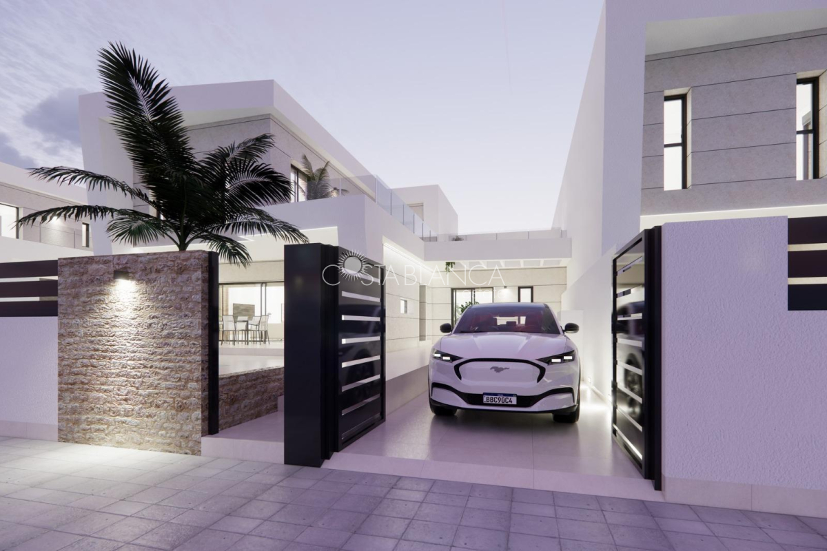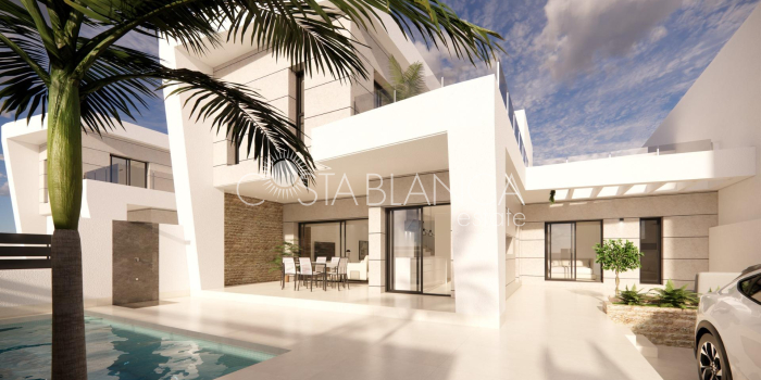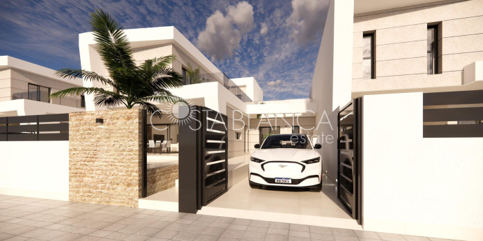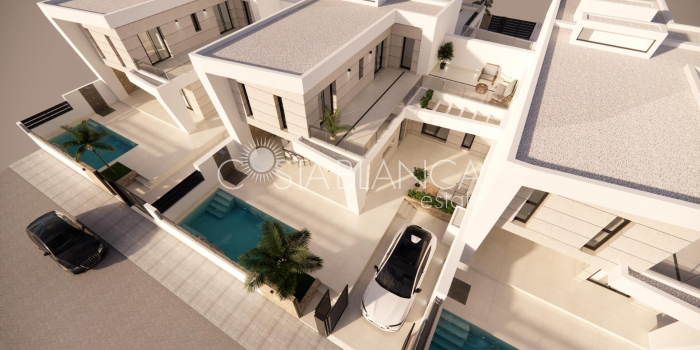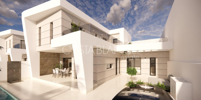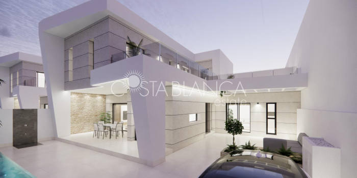 NEW BUILD SEMI-DETACHED VILLAS IN DOLORES New Build Residential of 6 semi-detached villas in Dolores. Beautiful semi-detached villas build over 2 floors with 3 bedrooms, 3 bathrooms, open plan kitchen with the lounge area, fitted wardrobes with dividers and drawer units, private garden with the pool and off road parking space, private solarium. The kitchen will be fitted with base, island over-bench cupboards, drawer units with telescopic runners with ball bearings, semi-automatic hinges and wall units with shelves. The worktop will be of compact quartz, colour to choose between black, white and grey. The sink will be stainless steel and mixer taps. The laundry room includes a bench with sink and base units. The toilet will be porcelain, wall-hung model. The washbasin will be made of porcelain (for countertop) in white, which will be installed on bathroom furniture and mirror. The taps will be Tres, Ramon Soler, or similar. The shower tray will be made of fibre. The toilet will be of porcelain suspended. The washbasin will be made of porcelain (for countertop) in white, which will be installed on bathroom furniture and mirror. The taps will be Tres, Ramon Soler or similar brand mixer taps. Urbanisation finished in porcelain stoneware and decorative areas with artificial grass and outdoor lighting. Plot fencing according to design, in vibro-compressed concrete block wall with continuous single-layer W1 mortar coating and metal fence according to design. Pedestrian entrance door and car access door (non-motorised) according to design similar to show house. Swimming pool with reinforced concrete pool tank gunned and finished in glazed stoneware. With compact model purifying station. Including staircase inside the pool for access and side bench with air jet impulsion by means of electric pump operated by touch button, shower and waterfall. Dolores is a town located in the comarca of Vega Baja del Segura in southern Alicante province, Spain. The town is in the heart of the Segura huerta about 10 km from the nearest beaches in La Marina and Guardamar. Complex located 30 minutes from Alicante airport and 1 hour Murcia - Corvera airport.