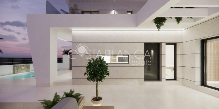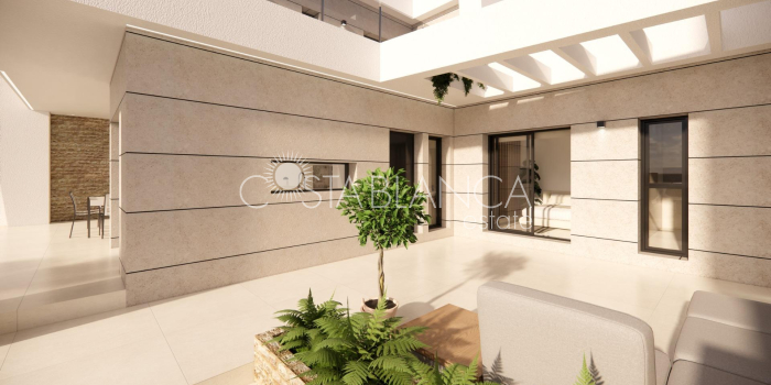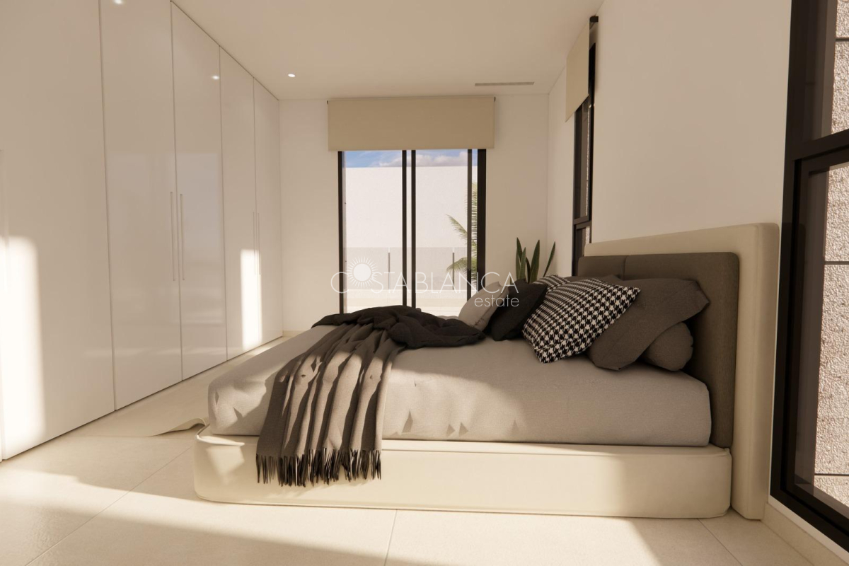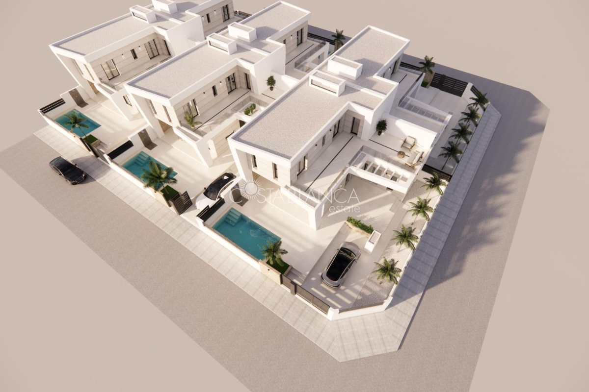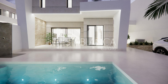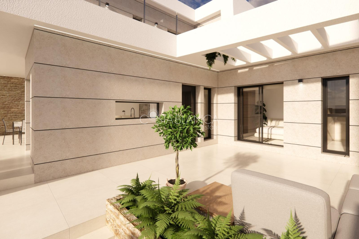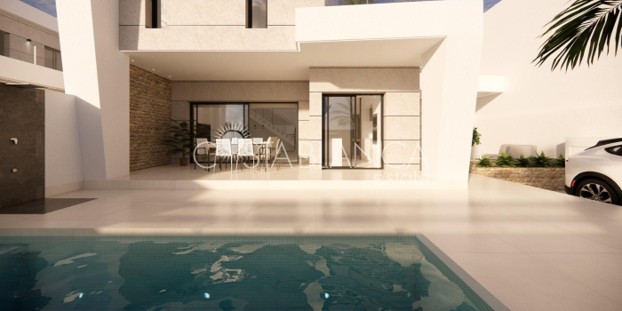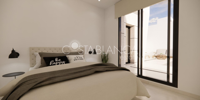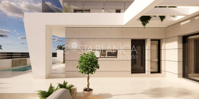 NEW BUILD SEMI-DETACHED VILLAS IN DOLORES New Build Residential of 6 semi-detached villas in Dolores. Beautiful semi-detached villas build over 2 floors with 3 bedrooms, 3 bathrooms, open plan kitchen with the lounge area, fitted wardrobes with dividers and drawer units, private garden with the pool and off road parking space, private solarium. The kitchen will be fitted with base, island over-bench cupboards, drawer units with telescopic runners with ball bearings, semi-automatic hinges and wall units with shelves. The worktop will be of compact quartz, colour to choose between black, white and grey. The sink will be stainless steel and mixer taps. The laundry room includes a bench with sink and base units. The toilet will be porcelain, wall-hung model. The washbasin will be made of porcelain (for countertop) in white, which will be installed on bathroom furniture and mirror. The taps will be Tres, Ramon Soler, or similar. The shower tray will be made of fibre. The toilet will be of porcelain suspended. The washbasin will be made of porcelain (for countertop) in white, which will be installed on bathroom furniture and mirror. The taps will be Tres, Ramon Soler or similar brand mixer taps. Urbanisation finished in porcelain stoneware and decorative areas with artificial grass and outdoor lighting. Plot fencing according to design, in vibro-compressed concrete block wall with continuous single-layer W1 mortar coating and metal fence according to design. Pedestrian entrance door and car access door (non-motorised) according to design similar to show house. Swimming pool with reinforced concrete pool tank gunned and finished in glazed stoneware. With compact model purifying station. Including staircase inside the pool for access and side bench with air jet impulsion by means of electric pump operated by touch button, shower and waterfall. Dolores is a town located in the comarca of Vega Baja del Segura in southern Alicante province, Spain. The town is in the heart of the Segura huerta about 10 km from the nearest beaches in La Marina and Guardamar. Complex located 30 minutes from Alicante airport and 1 hour Murcia - Corvera airport.