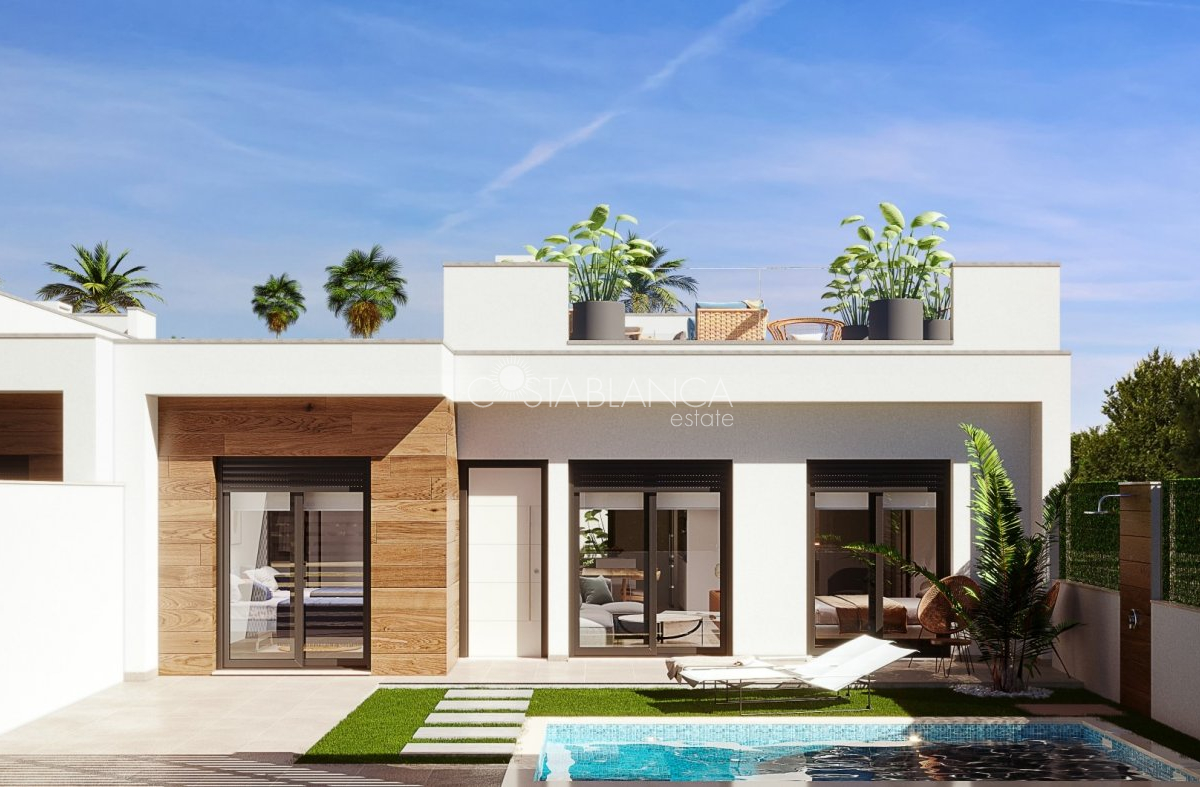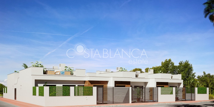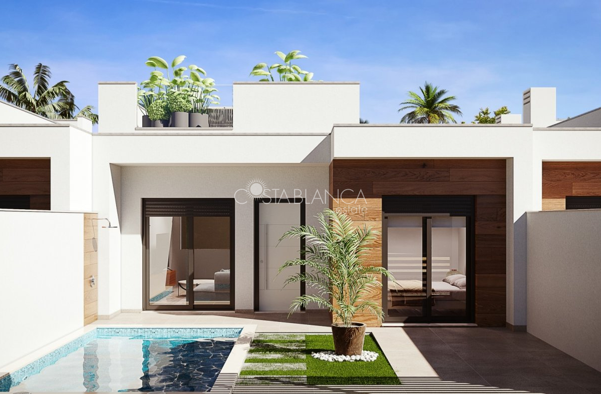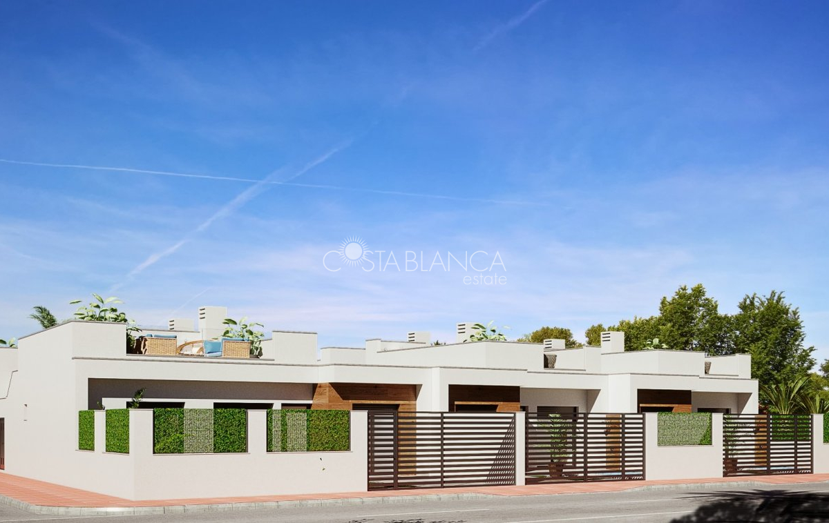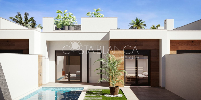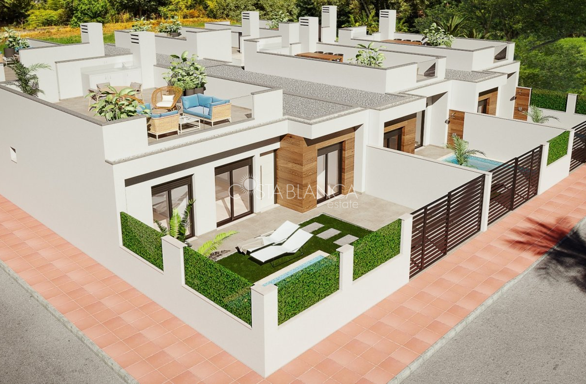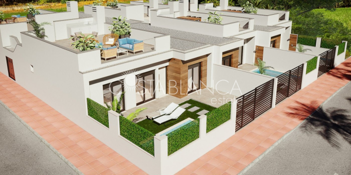 TERRACED VILLAS WITH PRIVATE POOL AND CLOSE TO RODA GOLF COURSE Luxury complex of 28 one level terraced villas with a private pool for each house. Homes are designed on one level with terrace areas on the ground floor and a large solarium on the first floor that allows you to enjoy all hours of sunshine, every day of the year. Each property has 2 or 3 bedrooms and 2 fitted bathrooms. Designed with a contemporary style and open plan concept, comprising a fitted kitchen and lounge-dining room. The development is located in Dolores de Pacheco (Murcia), near Los Alcázares, surrounded by services, parks, sports facilities, near several Golf Courses such as Roda Golf and La Serena Golf, plus being 5 minutes far from beach. The property will meet the highest standards and will be equipped with: Private pool with shower Solarium with summer kitchen Terrace areas Fitted kitchen with fridge freezer, hobs, oven, fan-extractor. Island work zone. Fully fitted bathrooms with vanity unit, mirror and shower screens Lined wardrobes with drawers Lighting design inside and outside the house Pre-installation for air conditioning