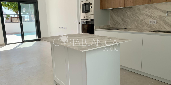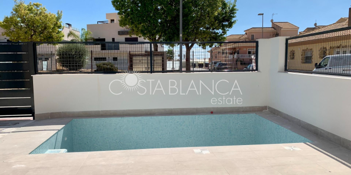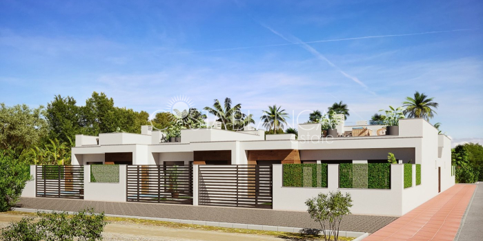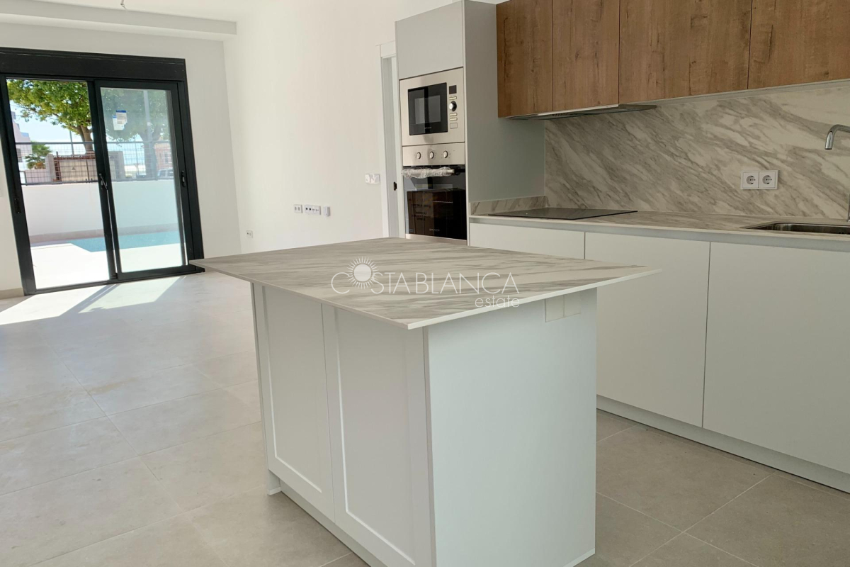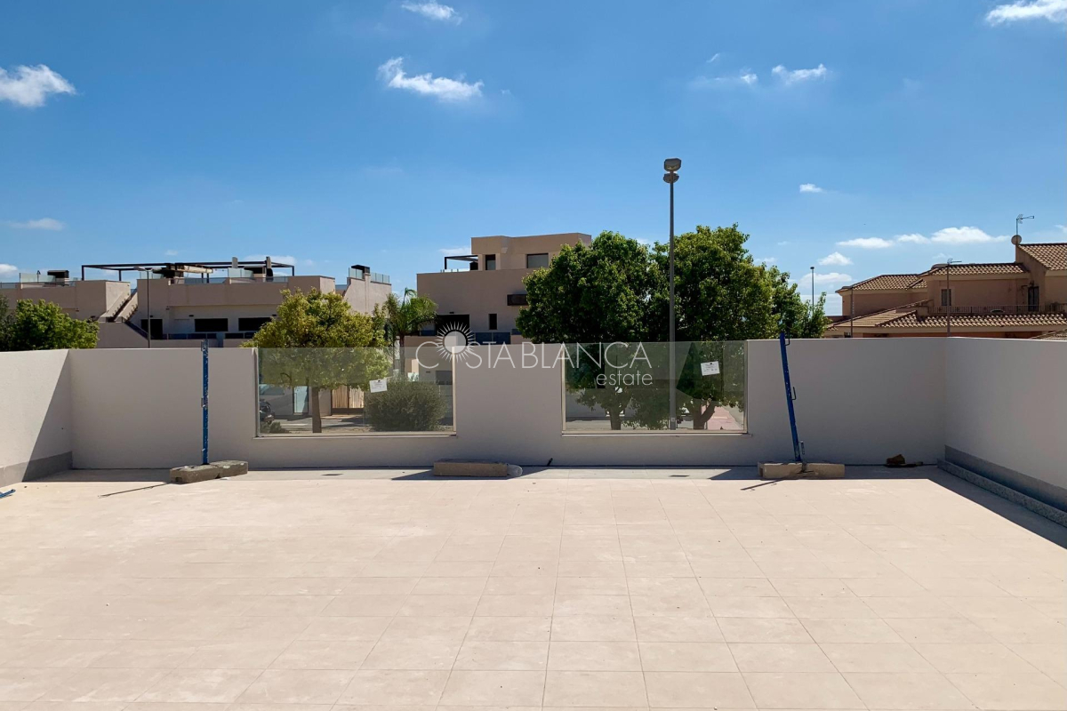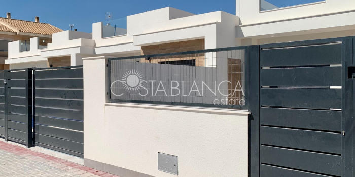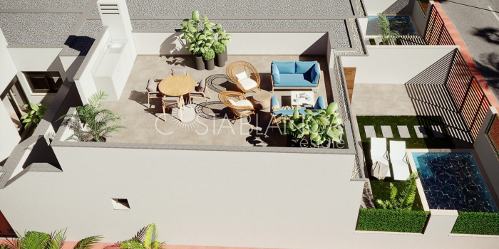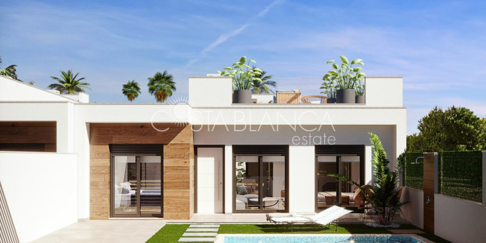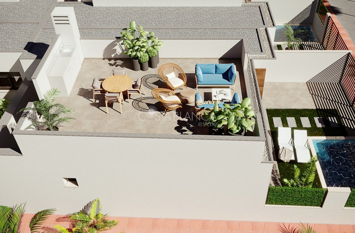 TERRACED VILLAS WITH PRIVATE POOL AND CLOSE TO RODA GOLF COURSE Luxury complex of 28 one level terraced villas with a private pool for each house. Homes are designed on one level with terrace areas on the ground floor and a large solarium on the first floor that allows you to enjoy all hours of sunshine, every day of the year. Each property has 2 or 3 bedrooms and 2 fitted bathrooms. Designed with a contemporary style and open plan concept, comprising a fitted kitchen and lounge-dining room. The development is located in Dolores de Pacheco (Murcia), near Los Alcázares, surrounded by services, parks, sports facilities, near several Golf Courses such as Roda Golf and La Serena Golf, plus being 5 minutes far from beach. The property will meet the highest standards and will be equipped with: Private pool with shower Solarium with summer kitchen Terrace areas Fitted kitchen with fridge freezer, hobs, oven, fan-extractor. Island work zone. Fully fitted bathrooms with vanity unit, mirror and shower screens Lined wardrobes with drawers Lighting design inside and outside the house Pre-installation for air conditioning