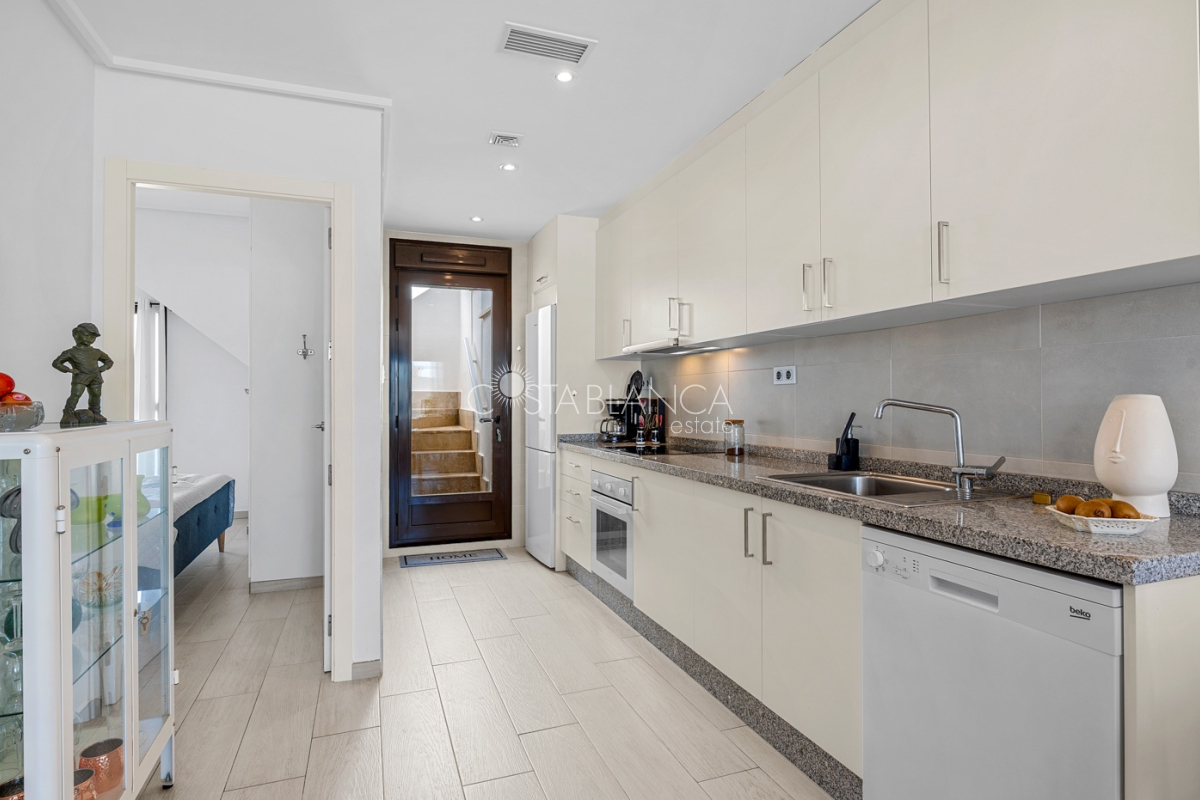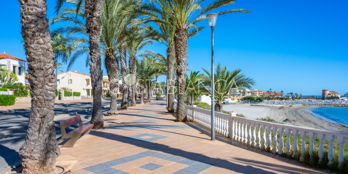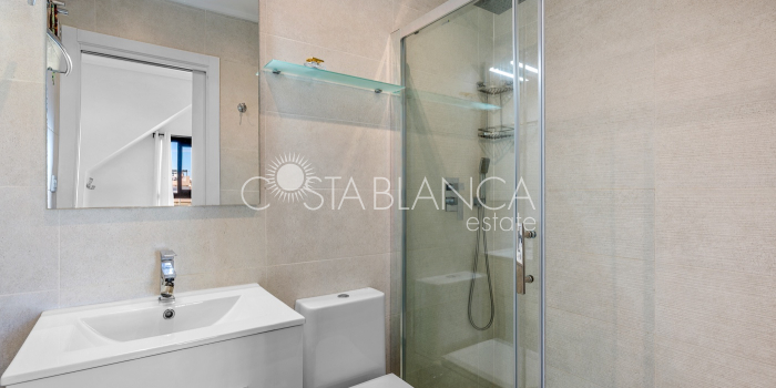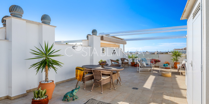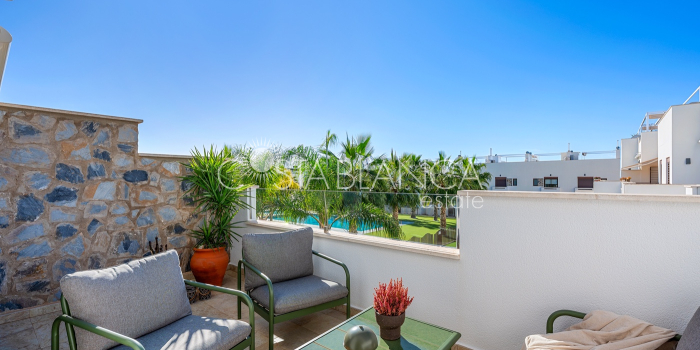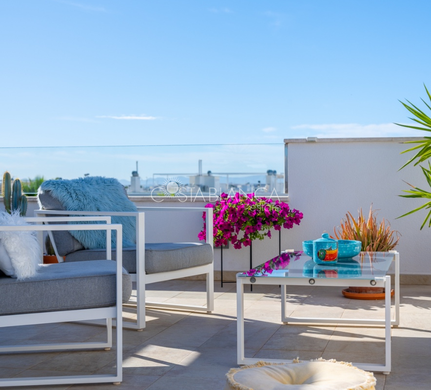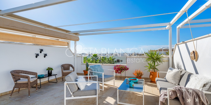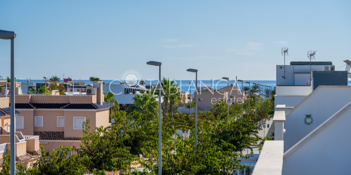 To piękne mieszkanie typu penthouse w Torre de la Horadada znajduje się w odległości spaceru od plaży, centrum handlowego i wielu innych atrakcji! Mieszkanie ma powierzchnię 67 m², w której znajdują się dwie podwójne sypialnie i dwie nowoczesne łazienki; jedna z nich przynależy do sypialni głównej. Jest także jasna kuchnia w układzie otwartym połączona z jadalnią i salonem. Z kuchni jest bezpośrednie wyjście na taras na dachu, a z salonu – na piękny taras od strony południowej. Mieszkanie wyposażone jest w centralną klimatyzację (ciepło/zimno) oraz ogrzewanie podłogowe w obu łazienkach. Strefa zewnętrznaPrzy wejściu do mieszkania znajduje się piękny taras od strony południowej z wysuwanym daszkiem i miejscem do siedzenia. Stąd roztacza się widok na część wspólną.Mieszkanie posiada również duży taras na dachu z miejscem na kilka stref wypoczynkowych. Część tarasu jest zadaszona wysuwanym daszkiem. Znajduje się tam również pomieszczenie gospodarcze. Mieszkanie jest częścią kompleksu mieszkalnego z basenem, jacuzzi, siłownią, sauną i terenami zielonymi. Do mieszkania przynależy prywatne miejsce parkingowe w garażu podziemnym.