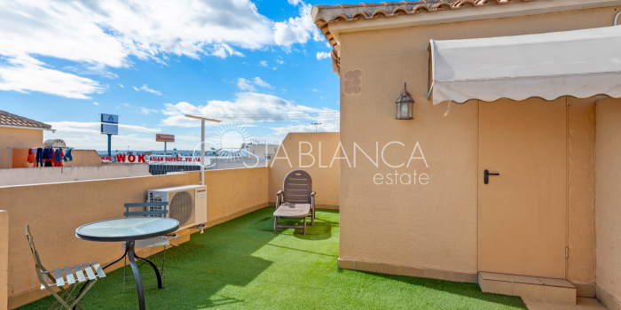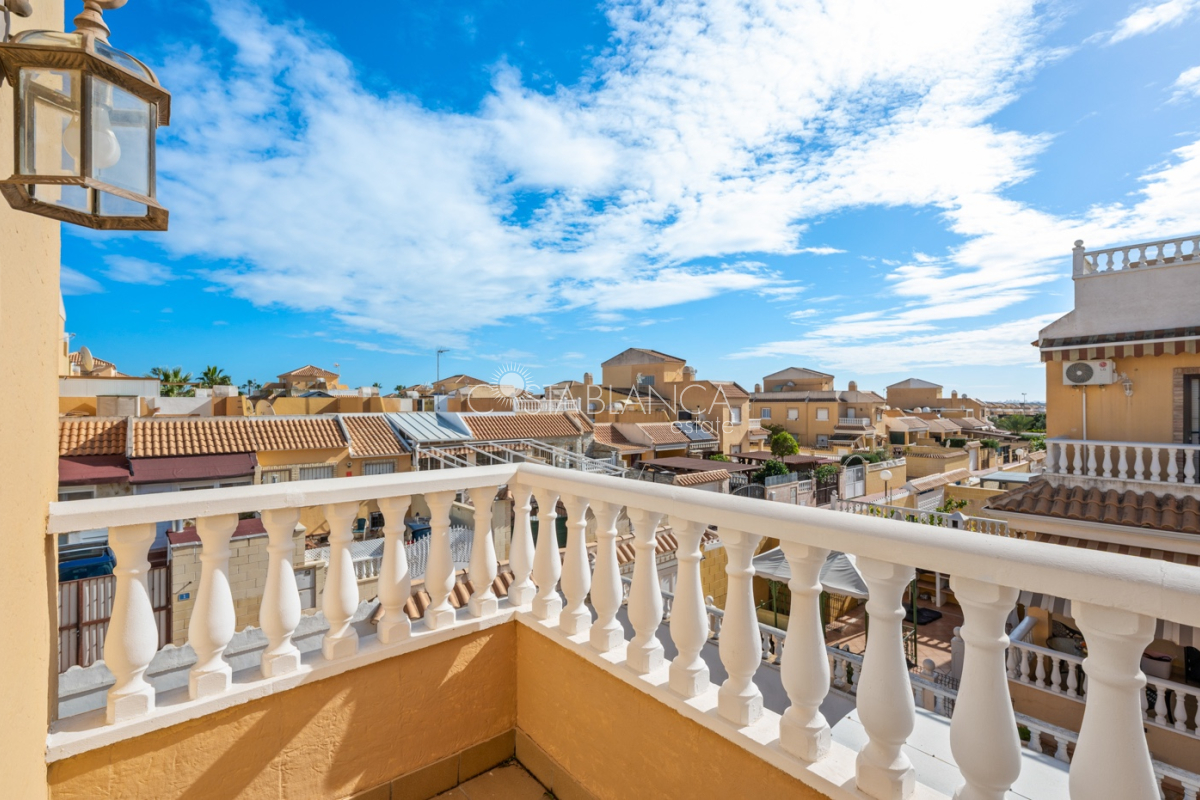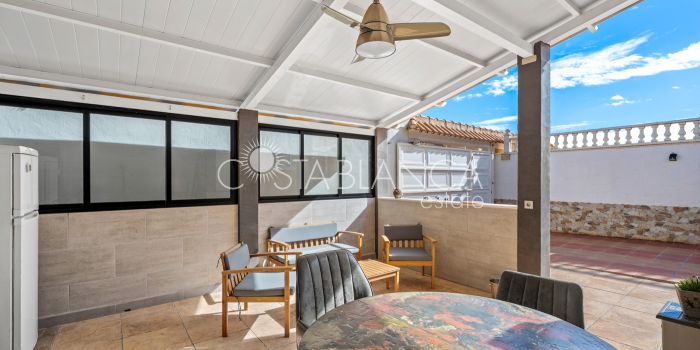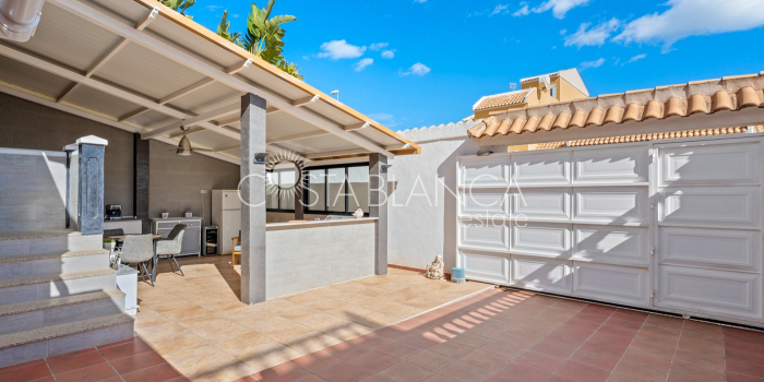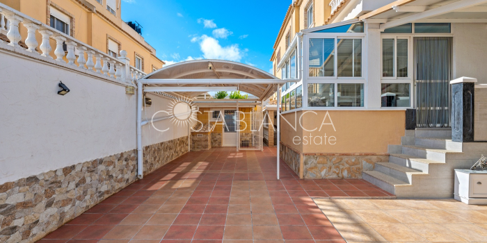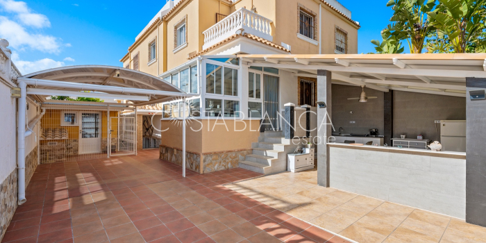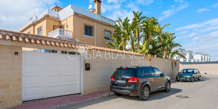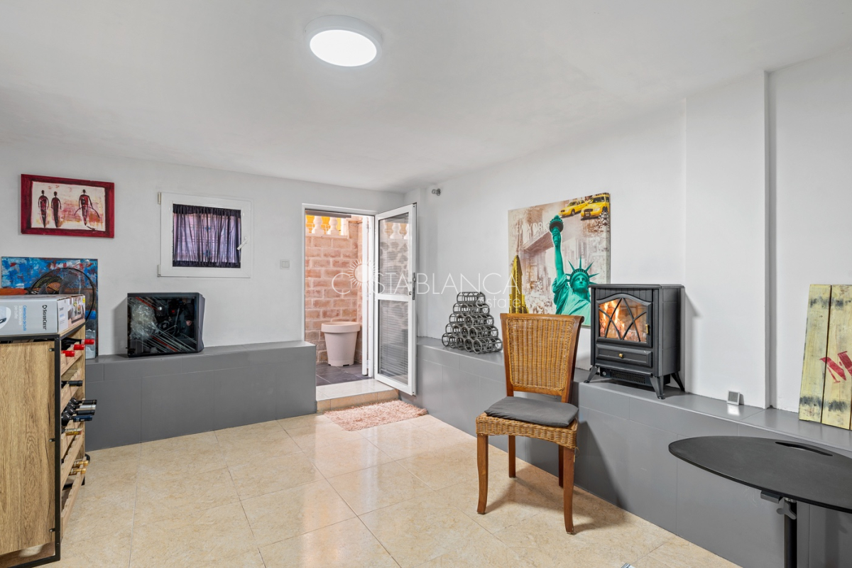 Fantastyczny, dwupiętrowy dom z solarium, zaprojektowany z myślą o komforcie, przestronności i całorocznym użytkowaniu. Po wejściu znajduje się przytulny, zadaszony ganek prowadzący do jasnego salonu. Na parterze, po prawej stronie, znajduje się sypialnia z garderobą, łazienką z prysznicem oraz w pełni wyposażoną, oddzielną kuchnią. Na piętrze znajdują się trzy sypialnie: duża sypialnia dwuosobowa z prywatnym tarasem, klimatyzacją i wentylatorem sufitowym oraz dwie sypialnie jednoosobowe, idealne dla rodziny, gości lub biura. Z tego piętra można wyjść na spektakularne solarium, idealne miejsce do relaksu, korzystania ze słońca przez cały rok i korzystania z jacuzzi. Nieruchomość posiada również całkowicie odnowioną piwnicę z salonem, sypialnią i łazienką z prysznicem, wyposażoną w klimatyzację i wentylację. Piwnica idealnie nadaje się na apartament gościnny, niezależne mieszkanie lub strefę wypoczynkową. Cały dom wyposażony jest w okna z podwójnymi szybami, wentylatory sufitowe i klimatyzację, co zapewnia komfort o każdej porze roku. Z boku domu znajduje się praktyczne pomieszczenie gospodarcze. Zewnętrzna część domu to kolejna wielka atrakcja: ogród z kuchnią letnią/zimową, idealny na spotkania i posiłki na świeżym powietrzu. Działka umożliwia parkowanie dwóch samochodów, a kompleks posiada wspólny basen. Uniwersalny, w pełni wyposażony dom, gotowy do zamieszkania, idealny zarówno na stałe miejsce zamieszkania, jak i jako inwestycja.