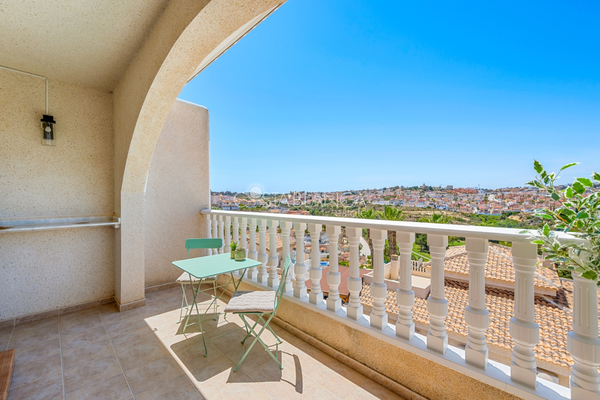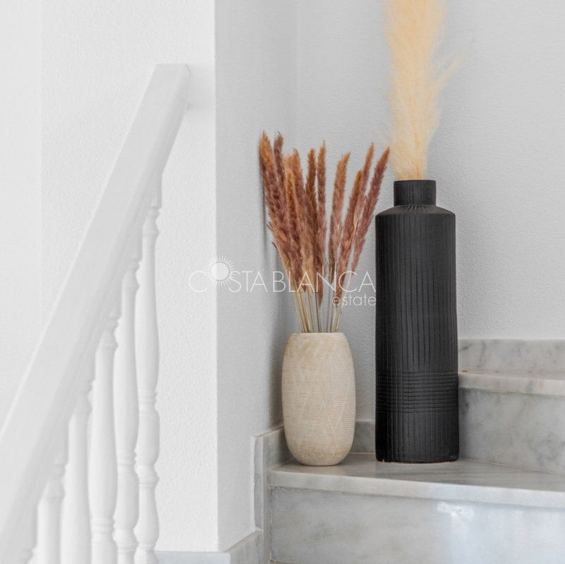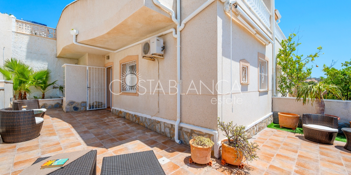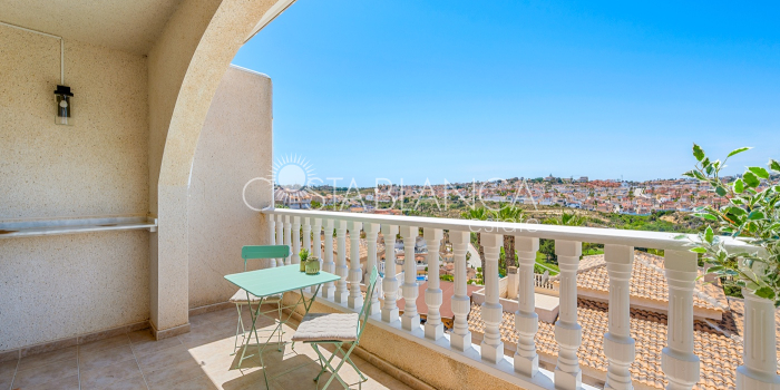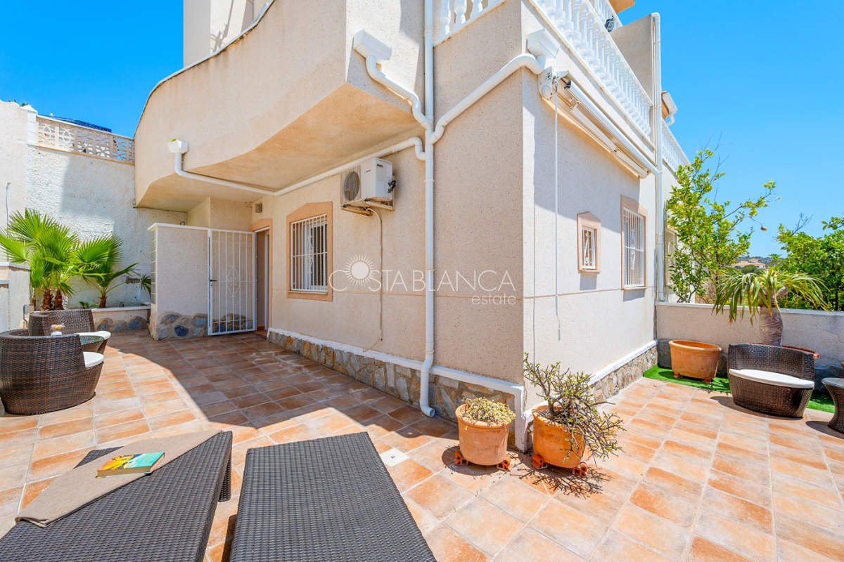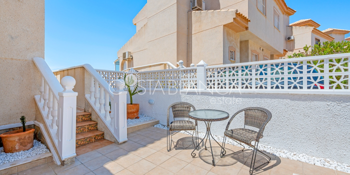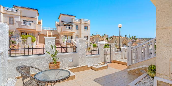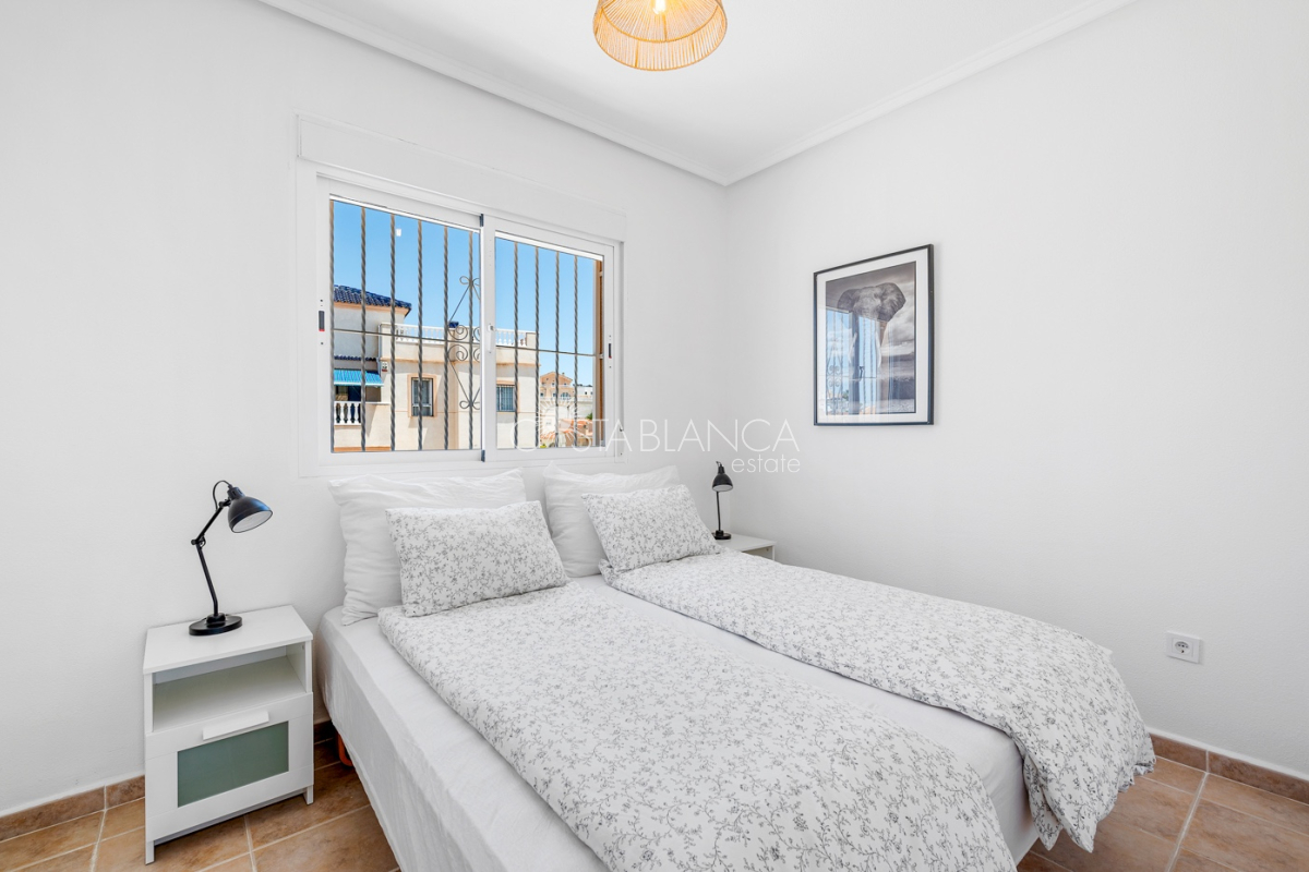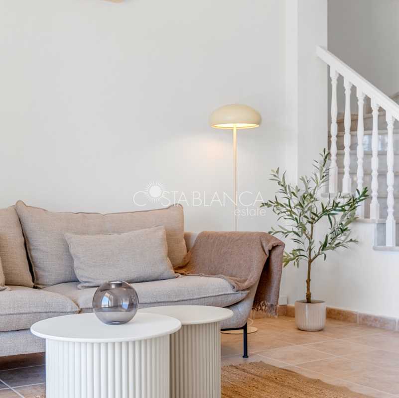Bliźniak z 3 sypialniami i pięknym widokiem na pole golfowe La Marquesa. Nieruchomość, wybudowana w 2006 roku, znajduje się na działce o powierzchni 137 m² i oferuje 105 m² przestrzeni mieszkalnej rozłożonej na trzech poziomach. Na głównym piętrze znajduje się niedawno odnowiona, w pełni wyposażona kuchnia otwarta na jadalnię i salon w jasnym, otwartym układzie. Na tym poziomie znajduje się również toaleta dla gości oraz dwa zewnętrzne tarasy: balkon od strony południowo-zachodniej z otwartym widokiem na pole golfowe La Marquesa i tereny zielone oraz uroczy przedni taras wychodzący na cichą ulicę – idealny na posiłki na świeżym powietrzu.Na pierwszym piętrze znajdują się dwie dodatkowe sypialnie z wbudowanymi szafami oraz łazienka. Z głównej sypialni można podziwiać piękne widoki na pole golfowe i góry. Na dolnym poziomie znajduje się przestronny pokój rekreacyjny, sypialnia, nowo wyremontowana łazienka oraz pralnia. Poziom ten prowadzi na duży, południowo-zachodni taras z częścią ogrodową i prysznicem zewnętrznym – idealny do relaksu w słońcu lub spotkań z gośćmi. Na najwyższym piętrze znajduje się prywatne solarium na dachu z panoramicznym widokiem na okoliczny krajobraz i pole golfowe – idealne miejsce do opalania się, czytania lub podziwiania zachodów słońca w całkowitej prywatności. Nieruchomość jest wyposażona w klimatyzację i trzy wbudowane szafy. Dzięki południowo-zachodniej orientacji zapewnia doskonałe nasłonecznienie przez cały dzień i dostęp do zadbanego basenu wspólnotowego. Położenie zaledwie kilka minut od pola golfowego La Marquesa czyni ją idealną dla miłośników golfa lub osób szukających spokojnej, zielonej okolicy blisko udogodnień.