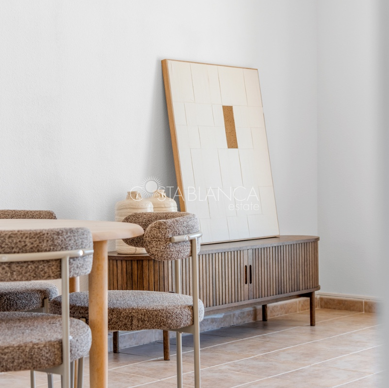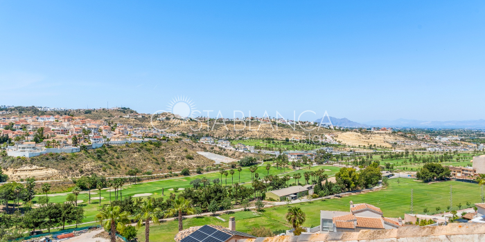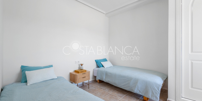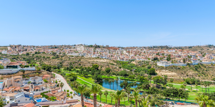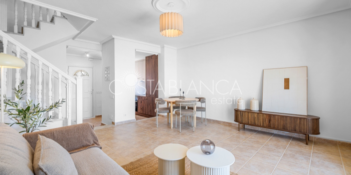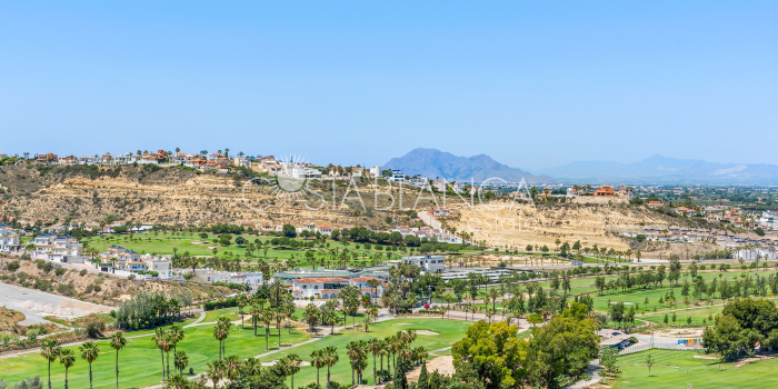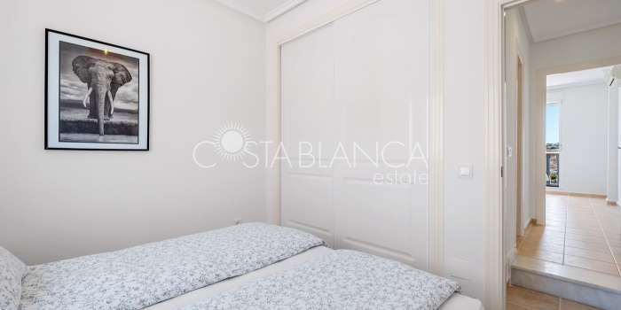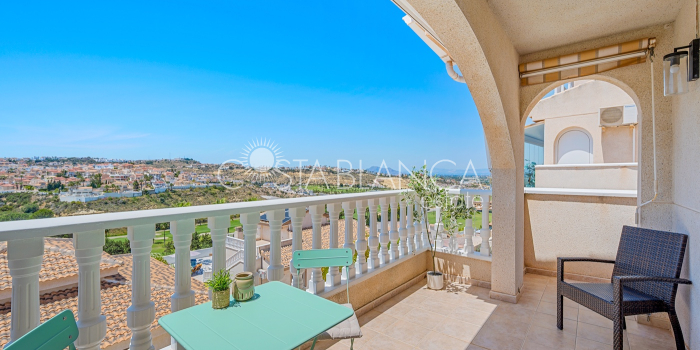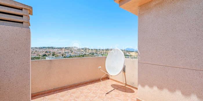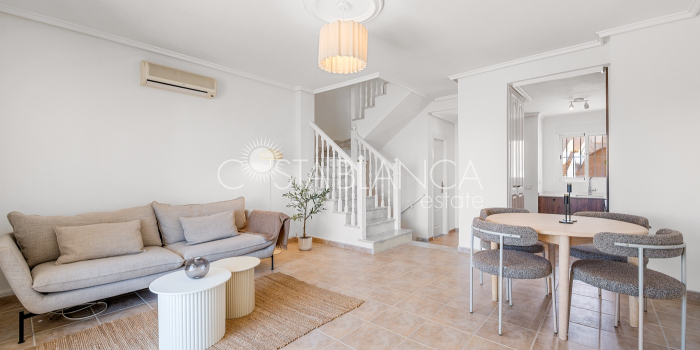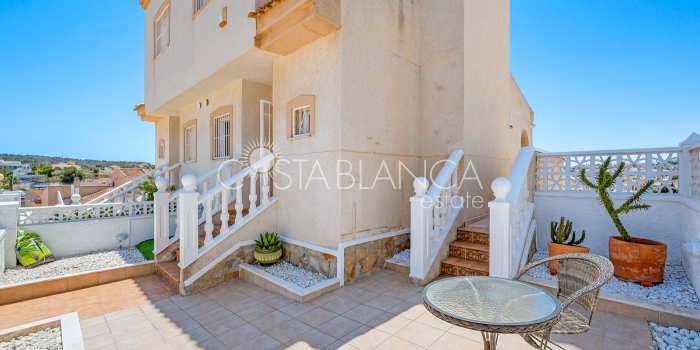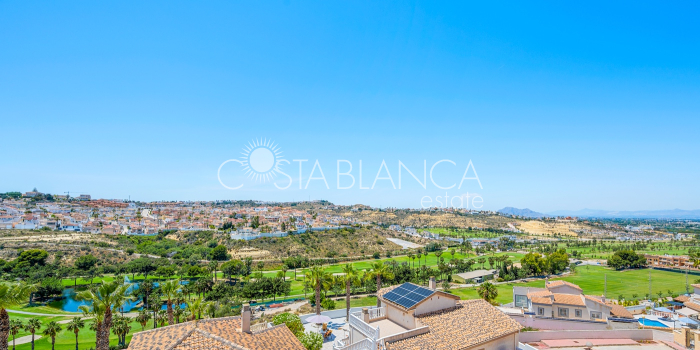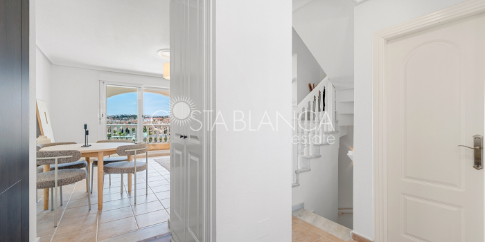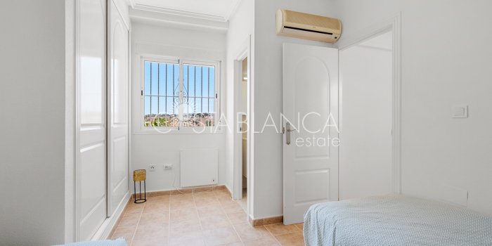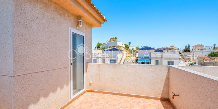Bliźniak z 3 sypialniami i pięknym widokiem na pole golfowe La Marquesa. Nieruchomość, wybudowana w 2006 roku, znajduje się na działce o powierzchni 137 m² i oferuje 105 m² przestrzeni mieszkalnej rozłożonej na trzech poziomach. Na głównym piętrze znajduje się niedawno odnowiona, w pełni wyposażona kuchnia otwarta na jadalnię i salon w jasnym, otwartym układzie. Na tym poziomie znajduje się również toaleta dla gości oraz dwa zewnętrzne tarasy: balkon od strony południowo-zachodniej z otwartym widokiem na pole golfowe La Marquesa i tereny zielone oraz uroczy przedni taras wychodzący na cichą ulicę – idealny na posiłki na świeżym powietrzu.Na pierwszym piętrze znajdują się dwie dodatkowe sypialnie z wbudowanymi szafami oraz łazienka. Z głównej sypialni można podziwiać piękne widoki na pole golfowe i góry. Na dolnym poziomie znajduje się przestronny pokój rekreacyjny, sypialnia, nowo wyremontowana łazienka oraz pralnia. Poziom ten prowadzi na duży, południowo-zachodni taras z częścią ogrodową i prysznicem zewnętrznym – idealny do relaksu w słońcu lub spotkań z gośćmi. Na najwyższym piętrze znajduje się prywatne solarium na dachu z panoramicznym widokiem na okoliczny krajobraz i pole golfowe – idealne miejsce do opalania się, czytania lub podziwiania zachodów słońca w całkowitej prywatności. Nieruchomość jest wyposażona w klimatyzację i trzy wbudowane szafy. Dzięki południowo-zachodniej orientacji zapewnia doskonałe nasłonecznienie przez cały dzień i dostęp do zadbanego basenu wspólnotowego. Położenie zaledwie kilka minut od pola golfowego La Marquesa czyni ją idealną dla miłośników golfa lub osób szukających spokojnej, zielonej okolicy blisko udogodnień.