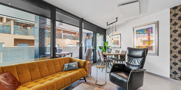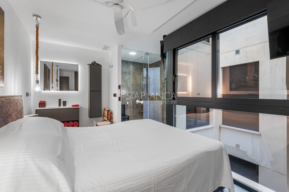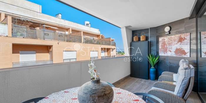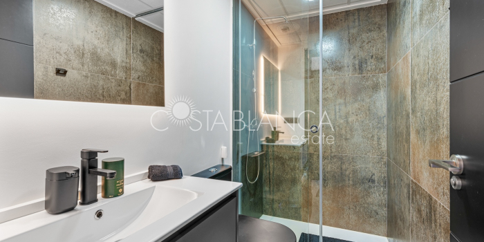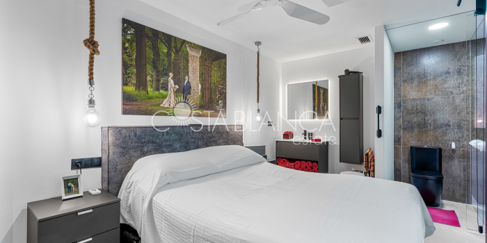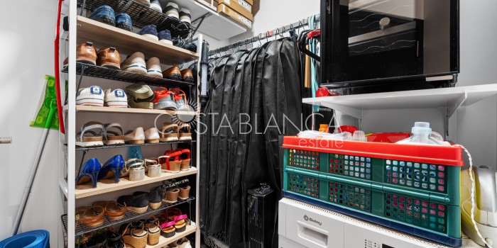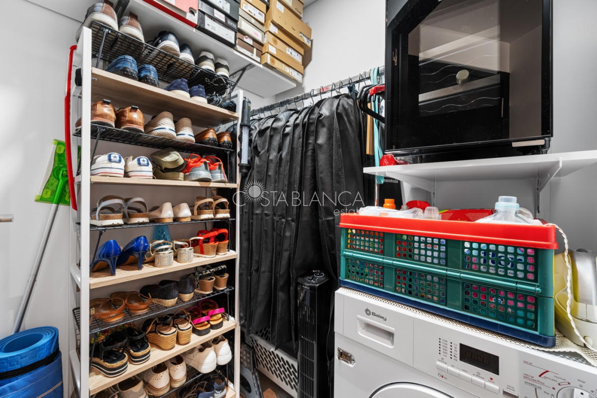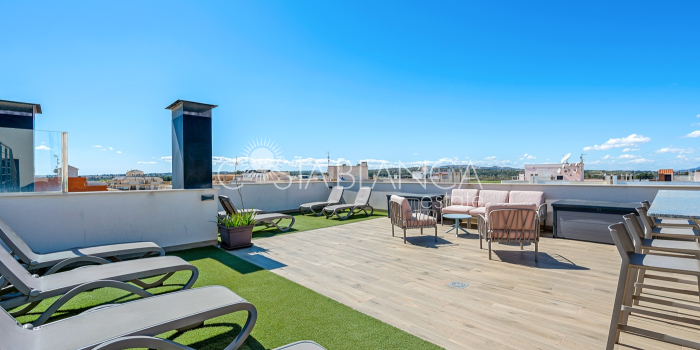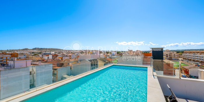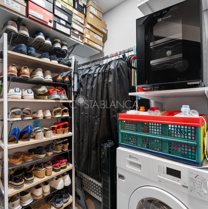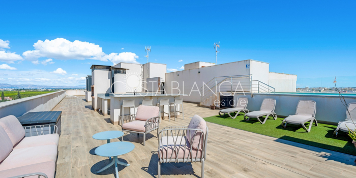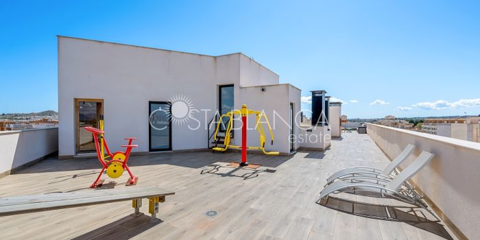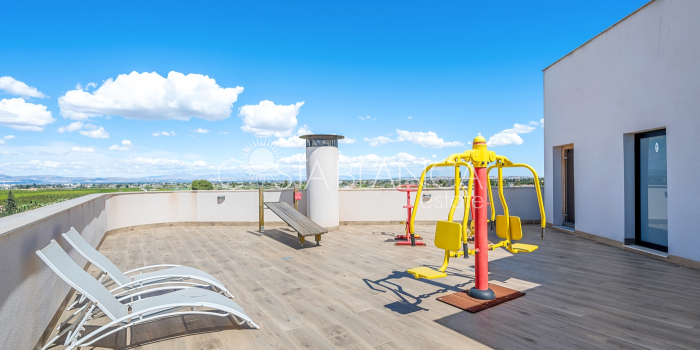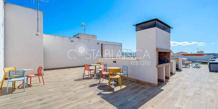Apartament położony w budynku Edificio Valentina w Formentera del Segura (Alicante), charakteryzuje się nowoczesnym designem, dużą ilością światła dziennego i wysoką jakością wykończenia. Składa się z dwóch sypialni, w tym jednej z prywatną łazienką, oraz drugiej łazienki z prysznicem. Obie łazienki mają nowoczesne wiszące meble, lustra z oświetleniem pośrednim, podwieszane toalety i prysznice bez brodzika. Kuchnia typu open space z płytą ceramiczną i okapem jest połączona z przestronnym salonem z wyjściem na zadaszony taras. Układ w kształcie litery L zapewnia funkcjonalność i wygodę. Dodatkowo mieszkanie ma przedpokój, osobne pomieszczenie gospodarcze, schowek oraz klimatyzację. Powierzchnia zabudowana: 92,70 m² (77 m² mieszkania + 15,70 m² tarasu).Powierzchnia użytkowa: 82,90 m² (67,20 m² mieszkania + 15,70 m² tarasu). Na dachu znajduje się wspólna przestrzeń z basenem (3 x 8 m), sauną, siłownią na świeżym powietrzu, strefą relaksu z leżakami oraz kuchnią z grillem. Lokalizacja: 12 km od plaży, 400 m od sklepów i usług, 30 minut od lotniska.