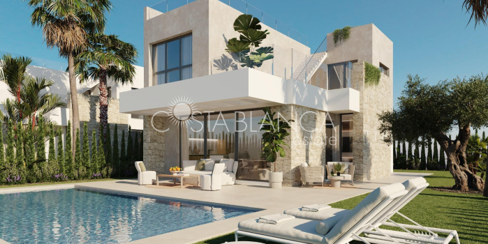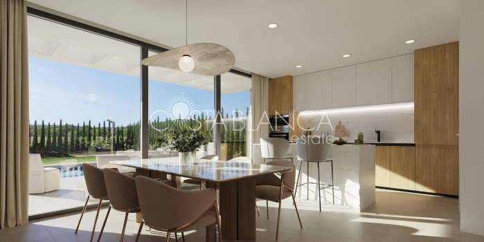 Nowoczesne, nowo wybudowane wille z widokiem na morze w Finestrat, Alicante Ekskluzywna inwestycja w doskonałej lokalizacji Położony w jednej z najbardziej poszukiwanych lokalizacji na wybrzeżu Costa Blanca, ten ekskluzywny projekt mieszkaniowy oferuje 18 niezależnych willi o nowoczesnym i funkcjonalnym designie. Położone w pobliżu Finestrat (4 km) i Benidormu (5 km), wille cieszą się wyjątkową lokalizacją z panoramicznym widokiem na morze i bezpośrednim widokiem na prestiżowe pole golfowe Puig Campana. Międzynarodowe lotnisko w Alicante znajduje się zaledwie 40 km od obiektu, co zapewnia wygodę i sprawność podróży. Nowoczesny design i przestronny układ Każda willa została starannie zaprojektowana, aby połączyć elegancję, komfort i praktyczność. Domy o powierzchni od 330 m² do 460 m² są rozmieszczone na dwóch kondygnacjach i oferują otwarte i jasne przestrzenie. Niektóre jednostki posiadają również piwnicę o powierzchni 66 m² z patio, w której znajdują się dwie dodatkowe sypialnie, dwie łazienki i salon, co zapewnia dodatkową wszechstronność dla gości lub do spędzania wolnego czasu. Życie na świeżym powietrzu i prywatne udogodnienia Każda nieruchomość jest oddawana do użytku z w pełni wykończonym ogrodem, prywatnym basenem, ogrodzeniem oraz bramami dla pieszych i pojazdów. Solarium na dachu stanowi idealne miejsce na relaks, cieszenie się słońcem i podziwianie zapierających dech w piersiach widoków na Morze Śródziemne. Przestronne tarasy i tereny zielone zostały zaprojektowane z myślą o życiu na świeżym powietrzu, pozwalając w pełni wykorzystać wyjątkowy klimat regionu. Wnętrza z wysokiej jakości wykończeniem Parter ma otwarty plan z salonem, jadalnią i w pełni wyposażoną nowoczesną kuchnią z blatem kwarcowym i zintegrowanymi urządzeniami. Okna od podłogi do sufitu zapewniają naturalne światło i tworzą płynne przejście między wnętrzem a otoczeniem zewnętrznym. Sypialnia na parterze dodaje elastyczności, a na piętrze znajdują się dwie kolejne sypialnie, w tym apartament główny z garderobą, prywatną łazienką i tarasem o powierzchni 30 m² z widokiem na morze. Wysokiej jakości wykończenia obejmują białą lakierowaną stolarkę wewnętrzną, szafy wnękowe, stolarkę zewnętrzną z przegrodą termiczną, rolety z napędem elektrycznym w sypialniach oraz 3 łazienki z designerskimi meblami, podwieszanymi toaletami i szklanymi ekranami. Styl życia i otoczenie Wille te oferują uprzywilejowany styl życia w pobliżu złotych plaż, centrów handlowych i atrakcji dla całej rodziny, takich jak park rozrywki Terra Mítica (5 km). Miłośnicy golfa mogą skorzystać z pól golfowych Puig Campana Golf (1 km) i Villaitana Golf (6 km) z dwoma polami zaprojektowanymi przez Nicklaus Design, które zapewniają światowej klasy wrażenia. Twój nowy dom na Costa Blanca Niezależnie od tego, czy szukasz domu wakacyjnego, czy stałego miejsca zamieszkania, te nowoczesne wille na Costa Blanca łączą w sobie luksus, lokalizację i komfort. Skontaktuj się z nami już dziś, aby umówić się na wizytę i zrobić pierwszy krok w kierunku swojego wymarzonego domu w Hiszpanii.